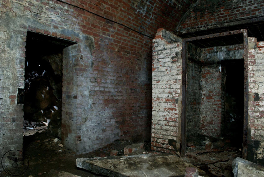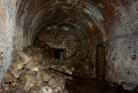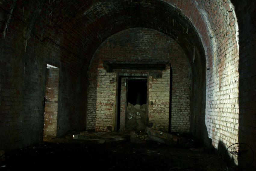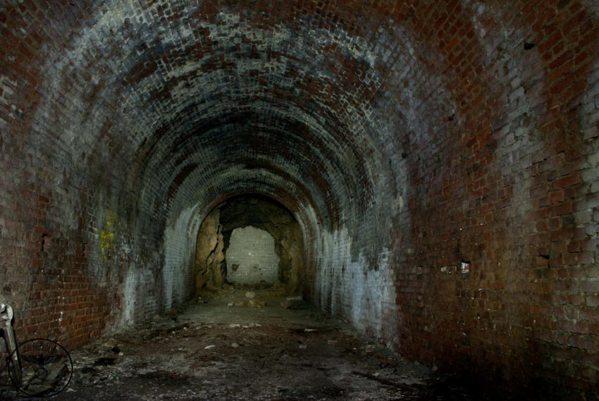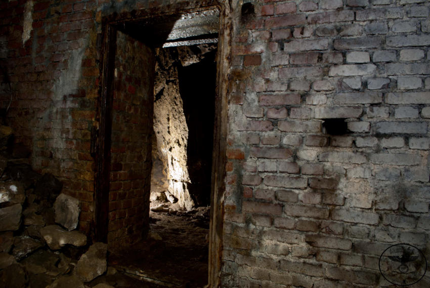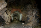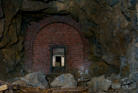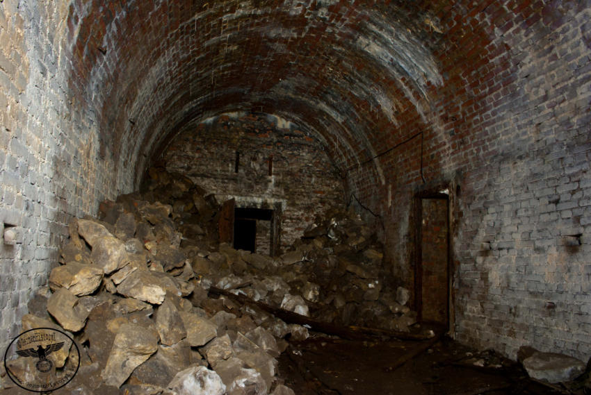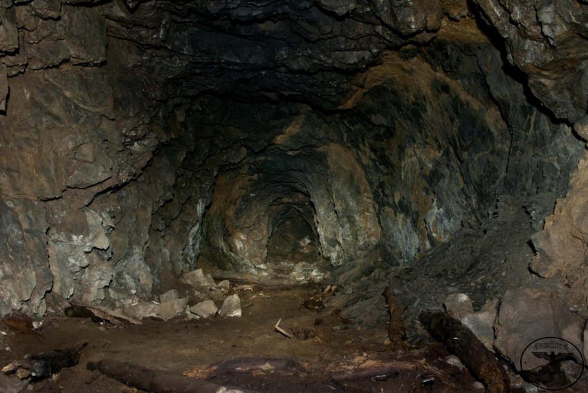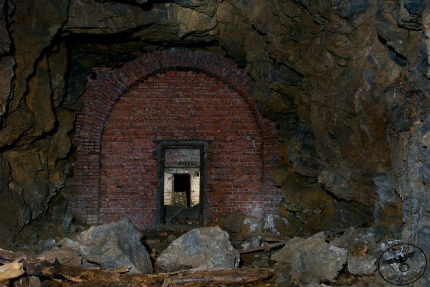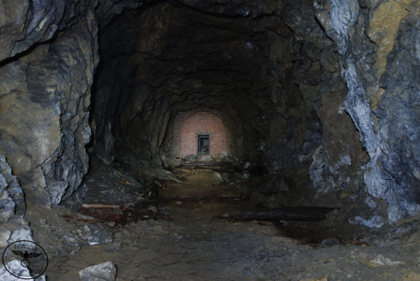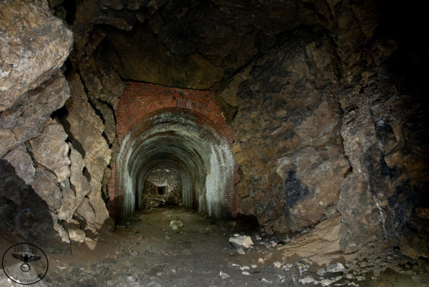 Heute sind wir in einem ehemaligen Steinbruch unterwegs, von der einstigen Nutzung ist nicht mehr viel zu erkennen. Wir stehen vor einer ca 6m hohen und 4m breiten zugemauerten Einfahrt. Auf Bodenniveau befindet sich ein kleines Loch was von Stacheldraht umgeben ist, wir schieben uns und das Gepäck durch die kleine Öffnung. Im Inneren können wir einen ca 200m langen Stollen befahren, er ist teilweise mit Backsteinen ausgebaut. An den nicht ausgebauten Stellen hängen oft bedrohliche Gesteinsbrocken. In diesem Stollen wurde im zweiten WK ein Dombunker für ein Eisenbahngeschütz mit einer 24cm Kanone errichtet. Der hintere Teil ist so stark verbrochen das es den Anschein hat das hier gesprengt wurde. Teilweise sind auch heute noch die Schienen vorhanden.