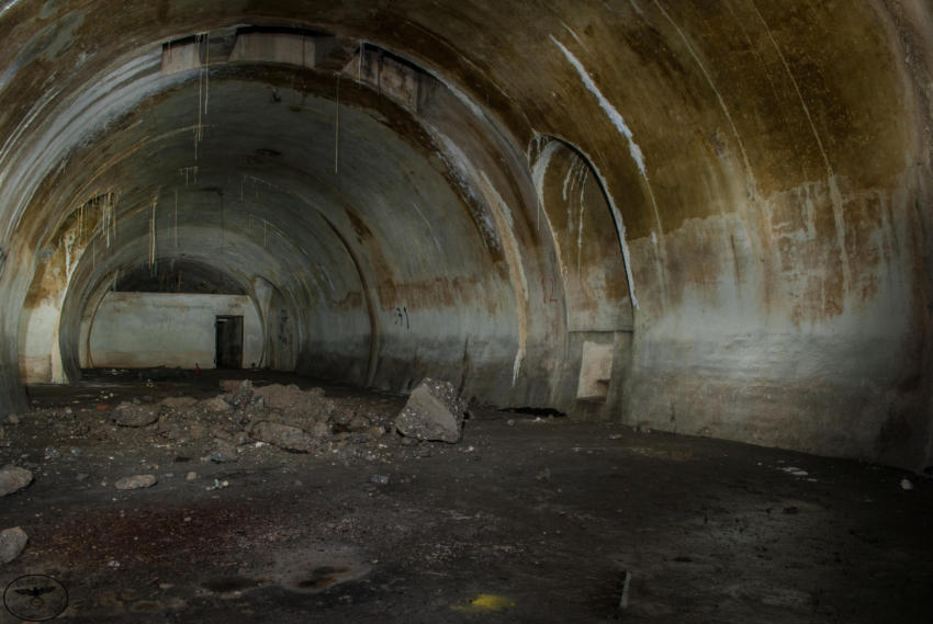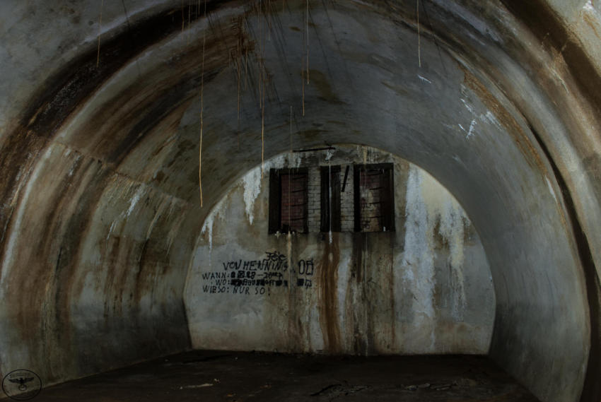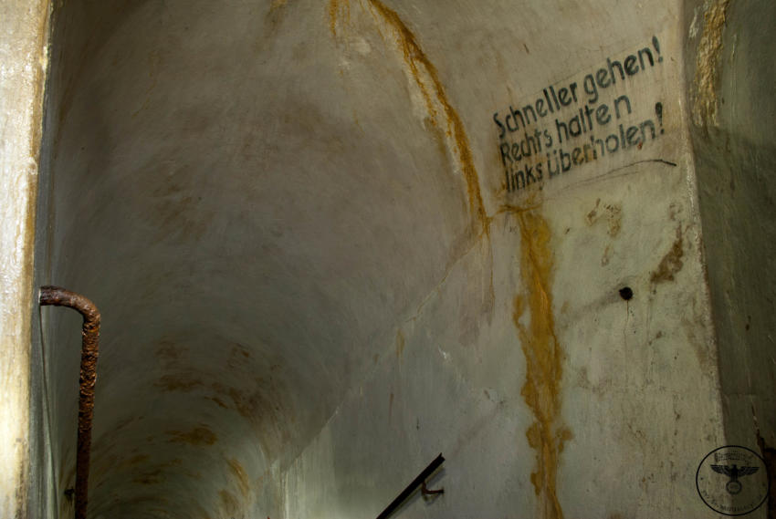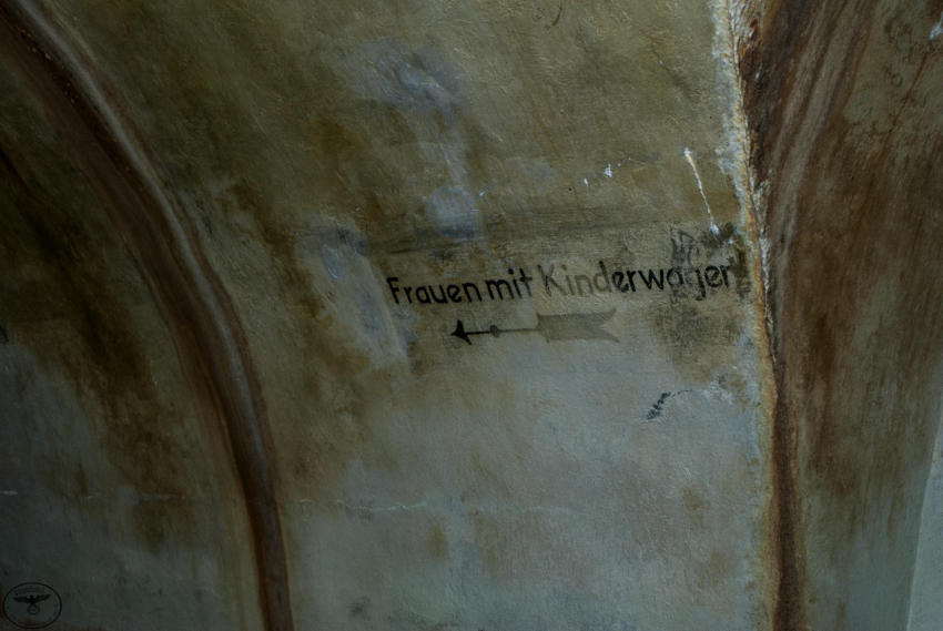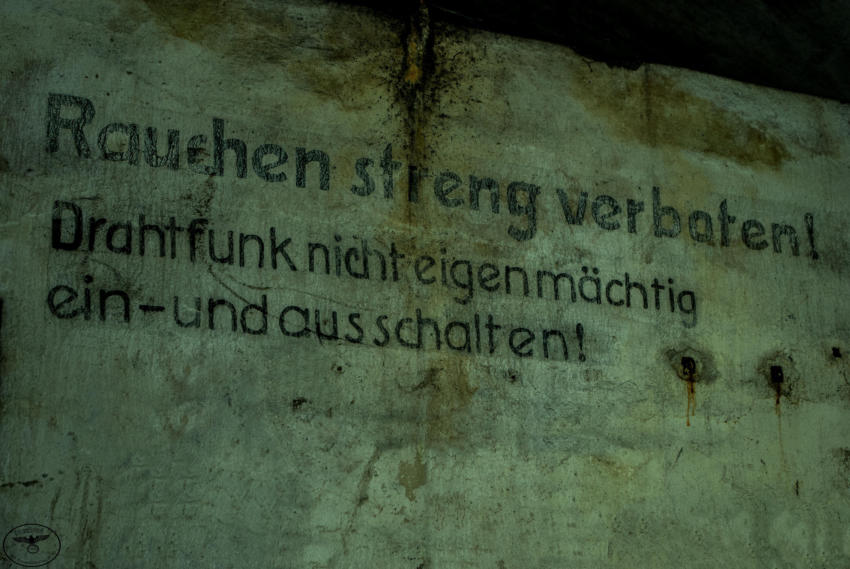 Diesen LS-Stollen konnten wir schon vor einiger Zeit besuchen. Die erste Treppe führte uns nur wenige Meter unter die Oberfläche in den Versorgungsteil, hier stand vermutlich die Heizungsanlage die mit Koks beheizt wurde und die Stromverteilung. Koks konnte durch zwei Öffnungen in der Decke angeliefert werden. Die Treppe wieder rauf und in die andere Richtung nach unten. Ca. 25m unter der Oberfläche befindet sich der Stollen, er ist ca 220 Meter lang. Ursprünglich hatte die Anlage vermutlich drei Zugänge wovon aber zwei verfüllt wurden und zwei Notausgänge wovon nur noch einer vorhanden ist aber dessen Steigeisen sind mittlerweile so marode das sie sich schon beim angucken auflösen. In der Mitte der Anlage und an ihrem Ende befanden sich die Lüftungsöffnungen. Ein großer Wassertank sorgte für genügend Trinkwasservorräte. Räume mit Aborte und Duschen waren für Frauen und Männer getrennt. Klare Anweisungen wie: “Durchgehen Mittelgang frei lassen” oder “Drahtfunk nicht eigenmächtig ein- und ausschalten” sind nur ein paar Beispiele und auch heute noch gut an den Wänden zu erkennen. Eine sehr gut erhaltene Anlage, bis auf ein paar wenige Schmierereien die schon ein paar Jahre alt sein dürften und das alte Lager eines Obdachlosen ist sie in einem guten Zustand. Zum Glück ist sie mittlerweile auch wieder gut verschlossen!