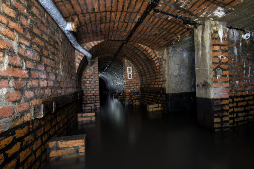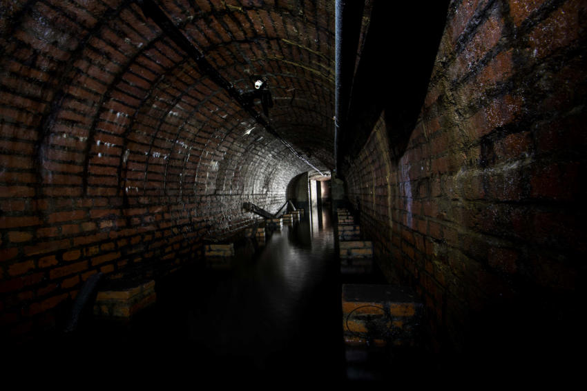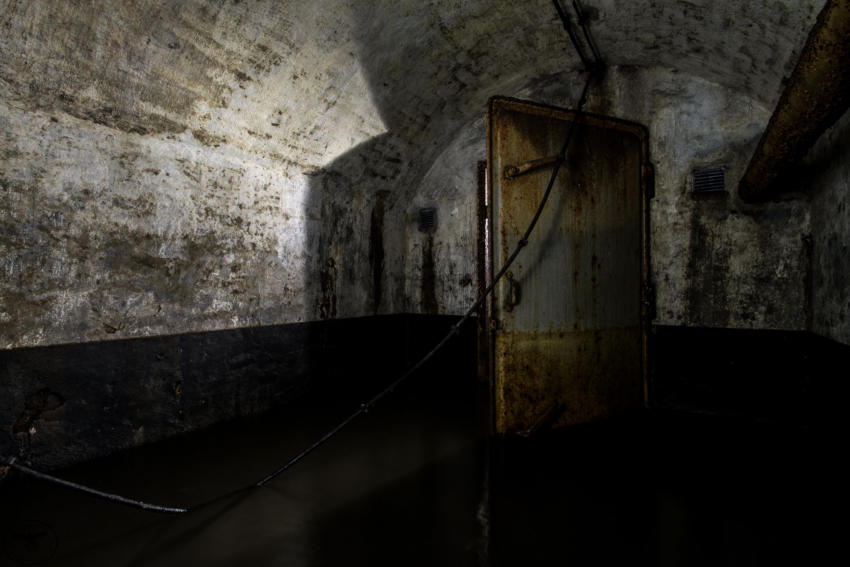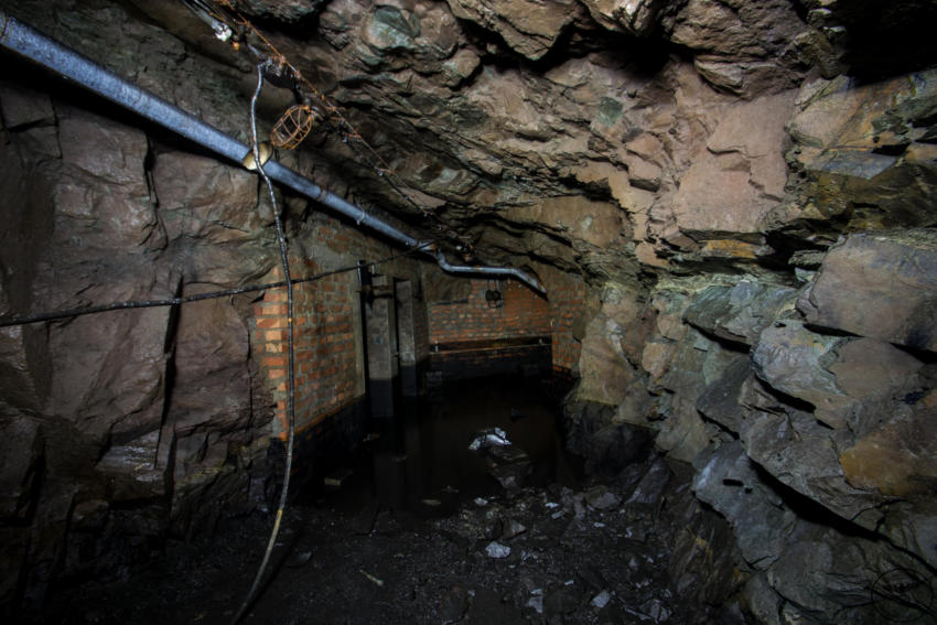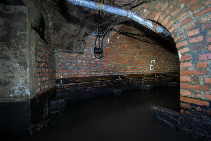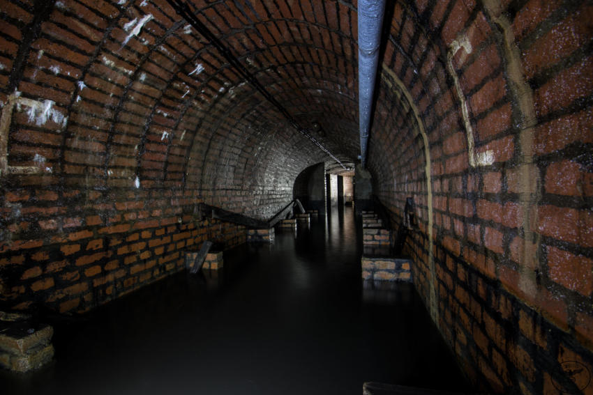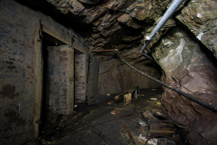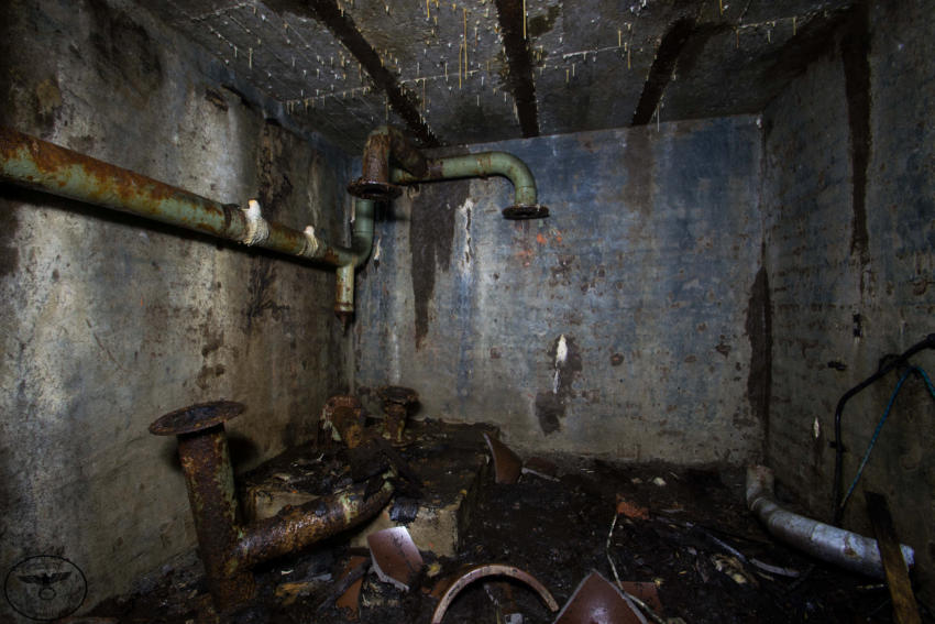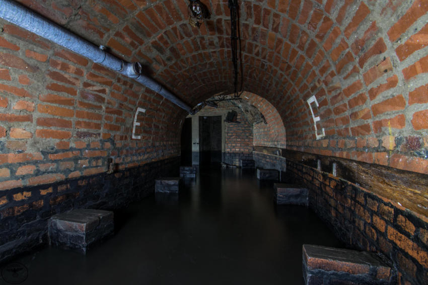 Dieser Werksluftschutzstollen verfügte ursprünglich über zwei Eingänge und hat eine geschätzte Gesamtlänge von ca. 100-150m. Der größte Teil der Anlage steht fast Kniehoch unter Wasser, so das wir ihn nur mit Watthosen betreten konnten. Noch gut zu erkennen sind rechts und links die Sockel auf denen einst die Bänke für die Schutz suchenden montiert waren. Auch Teile der Rückenlehnen aus Holz sind noch vorhanden. Von der Lüftungsanlage sind nur noch die Rohre vorhanden, Filter usw. fehlen komplett. Der Stollen war in die Blöcke A,B,C,D & E aufgeteilt und in drei Blöcke gab es Nischen mit den Aborten. Viel mehr gibt es über diese Anlage auch nicht zu berichten.